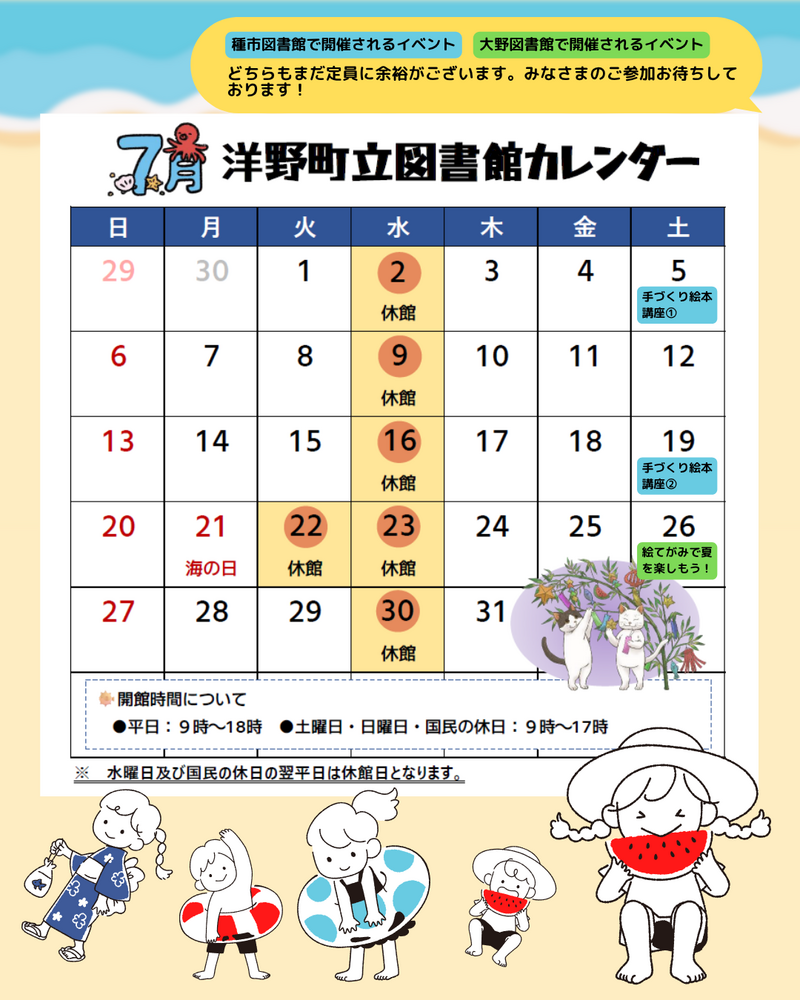 洋野町立図書館の7月のカレンダーをお知らせいたします。