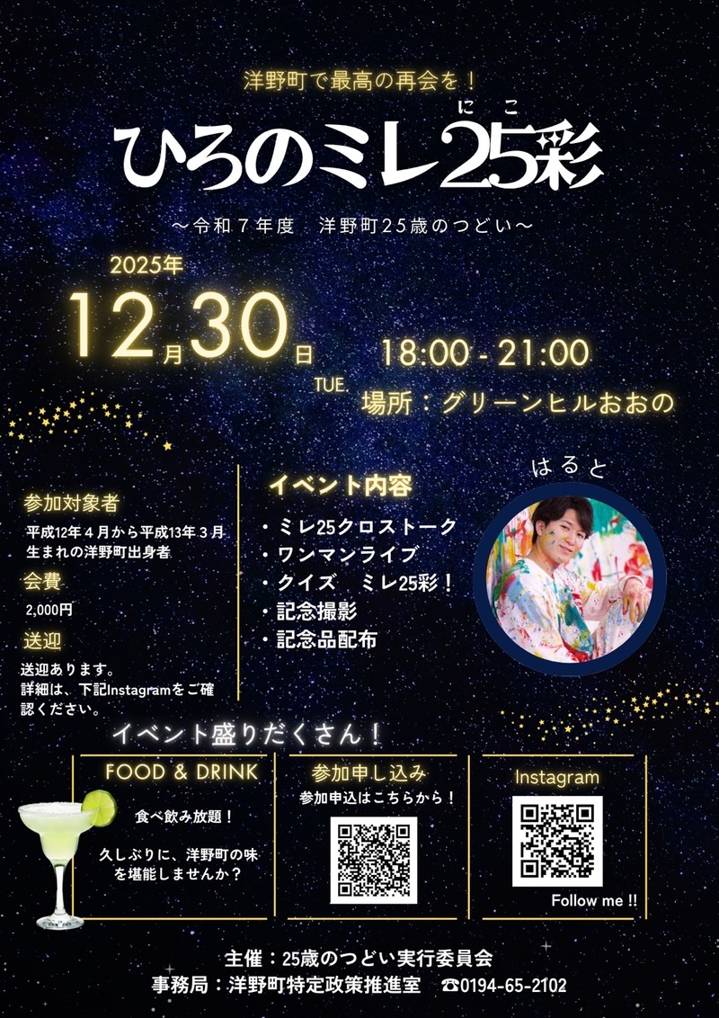 今年度25歳となる方を対象に「ひろのミレ25彩 ~令和7年度 洋野町25歳のつどい~」を開催します