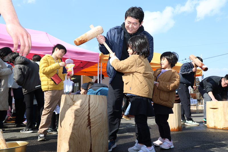 「中野青年会もちつき大会」(中野青年会主催)は2月15日、中野漁村センターで開催されました。地域活性化の一環で、昨年に引き続き開催された同行事。地域住民ら約100人が会場を訪れ、大人も子どもも威勢よくもちをつき、会場には笑顔があふれました。