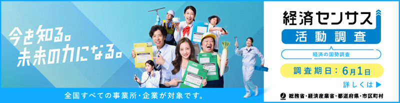 「経済センサスー活動調査」は、すべての産業分野の売上(収入)金額や費用などの経理項目を同一時点で網羅的に把握し、我が国における事業所・企業の経済活動を全国及び地域別に明らかにすることを目的としています。
