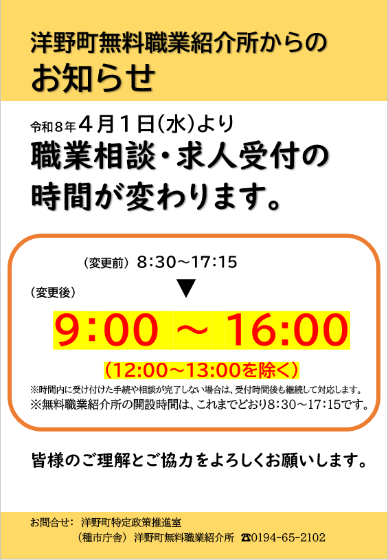 無料職業紹介所の運営体制の変更に伴い、令和8年4月1日より洋野町無料職業紹介所/洋野町大野無料職業紹介所の職業相談・求人受付の時間が変更となりますのでお知らせします。 ご利用の皆様には、ご不便をおかけしますが何卒ご理解くださいますようお願いいたします。